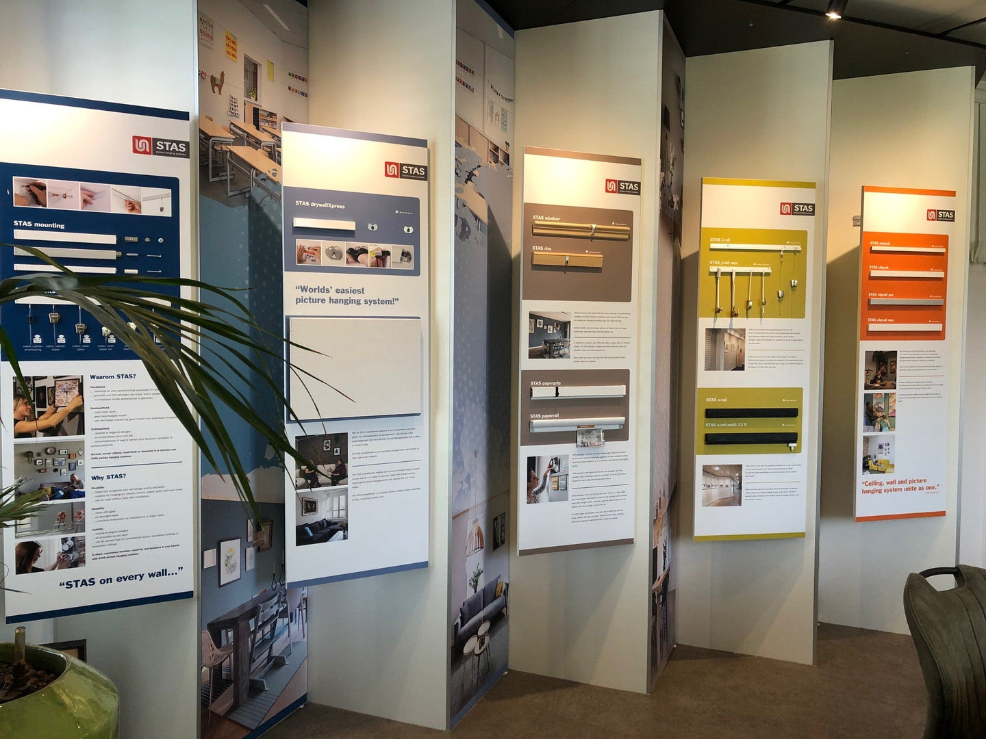 Les murs de vos pièces sont de grandes toiles. Quelle histoire souhaitez-vous raconter ? Une famille heureuse avec un collage de photos ? Une œuvre d’art originale ? Un espace de travail bien organisé ? Les rails de suspension STAS sont la solution idéale pour les intérieurs modernes, les bureaux, les musées et les galeries. Accrocher un cadre photo ou un tableau devient un jeu d’enfant avec tous les systèmes de suspension STAS.