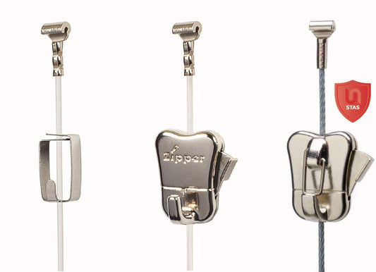 Mousqueton STAS Smartspring sur cordelette Perlon – supporte des charges jusqu'à 4 kg. Fermeture éclair STAS (Pro) sur câble en acier gainé blanc – supporte des charges jusqu'à 10 kg. Fermeture éclair STAS (Pro) sur cordelette Perlon – supporte des charges jusqu'à 15 kg. Fermeture éclair STAS (Pro) sur câble en acier standard – supporte des charges jusqu'à 20 kg.
